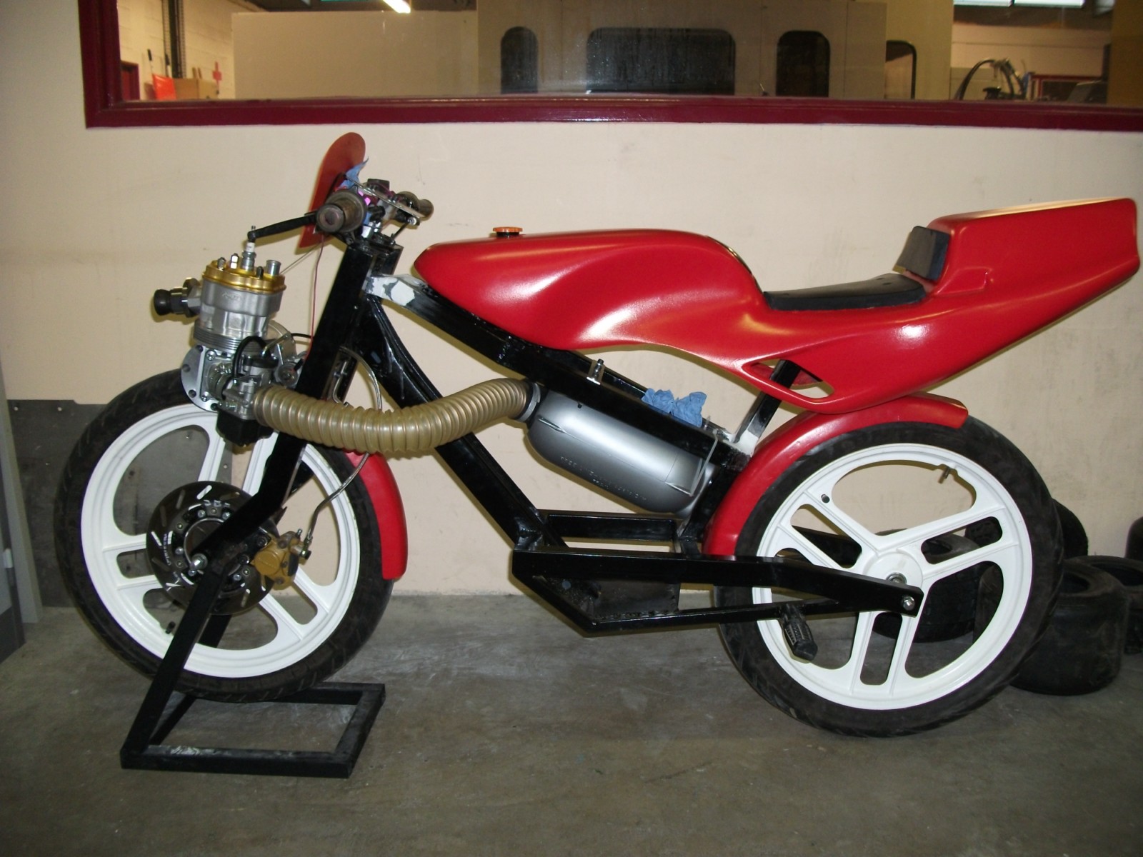 mise en place sur le cadre du garde boue avant fait maison, de la boite à air de karting, de la durite de frein type aviation et de la bobine d'allumage