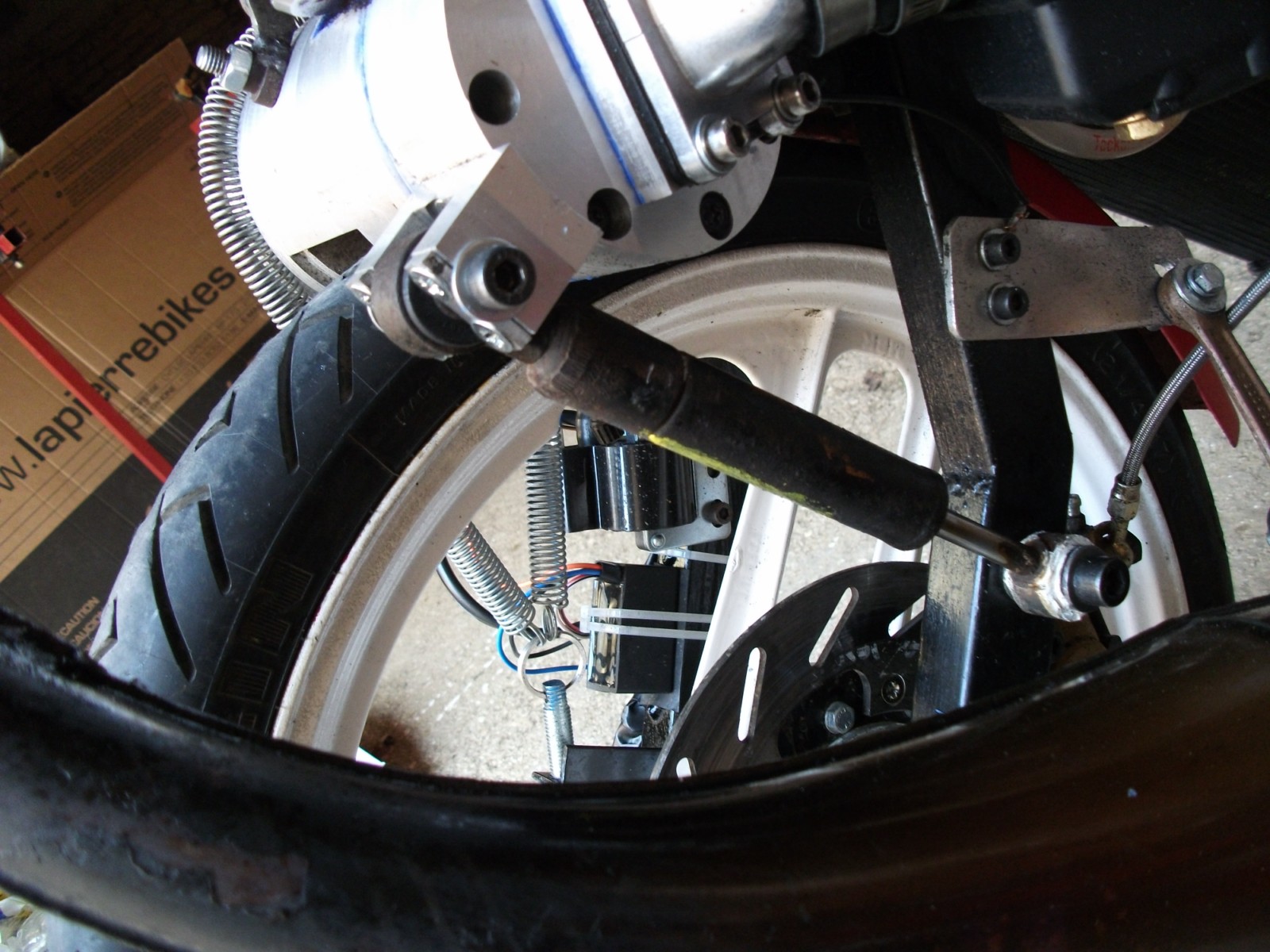 montage d'un amortisseur de r21 entre le moteur et la fourche pour atténuer les vibrations.