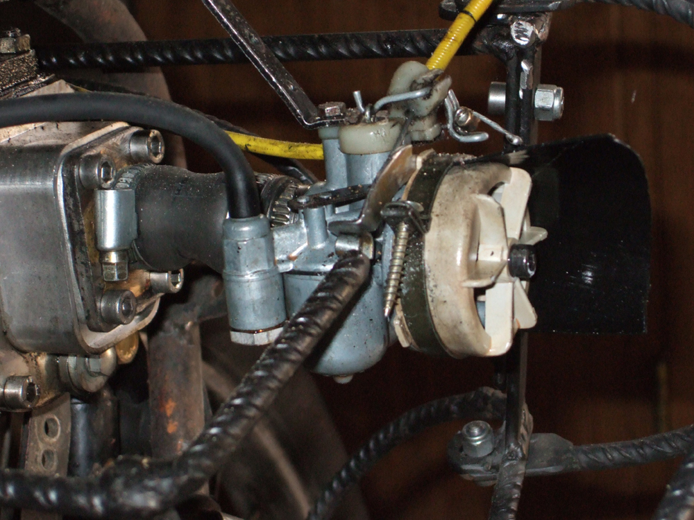 carbu de 103 d'origine avec gicleur réglable, monté sur une durite hydraulique souple