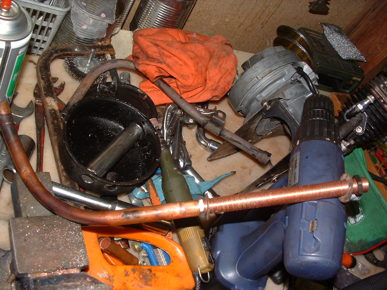 pot d'chappement fait par un tube 16 mm traversant la gamelle d'origine et bloqué par 2 ecrous sur une entretoise alu percée tout le long par des trous de 4mm le tout en fixation d'origine!