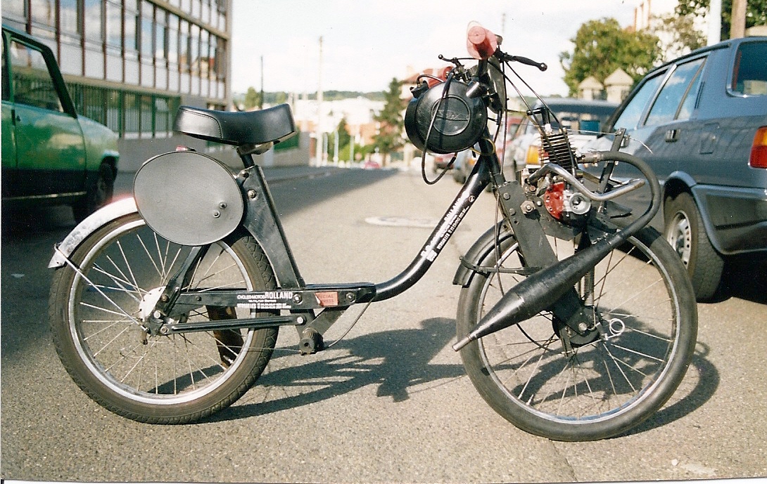 Solex équipé d'un cadre 1700 avec carter moteur origine 3800 renforcé à la résine et à la fibre, Cylindre, piston, bielle, vilebrequin d'origine plus ou moins transformé, allumage Motoplat rotor externe,Pot d'échappement maison, roue arrière Av Peugeot 103, roue avant Ar Solex.