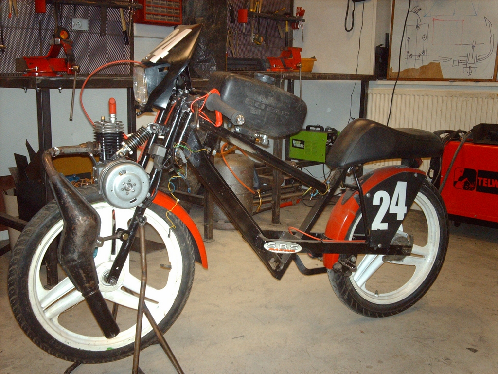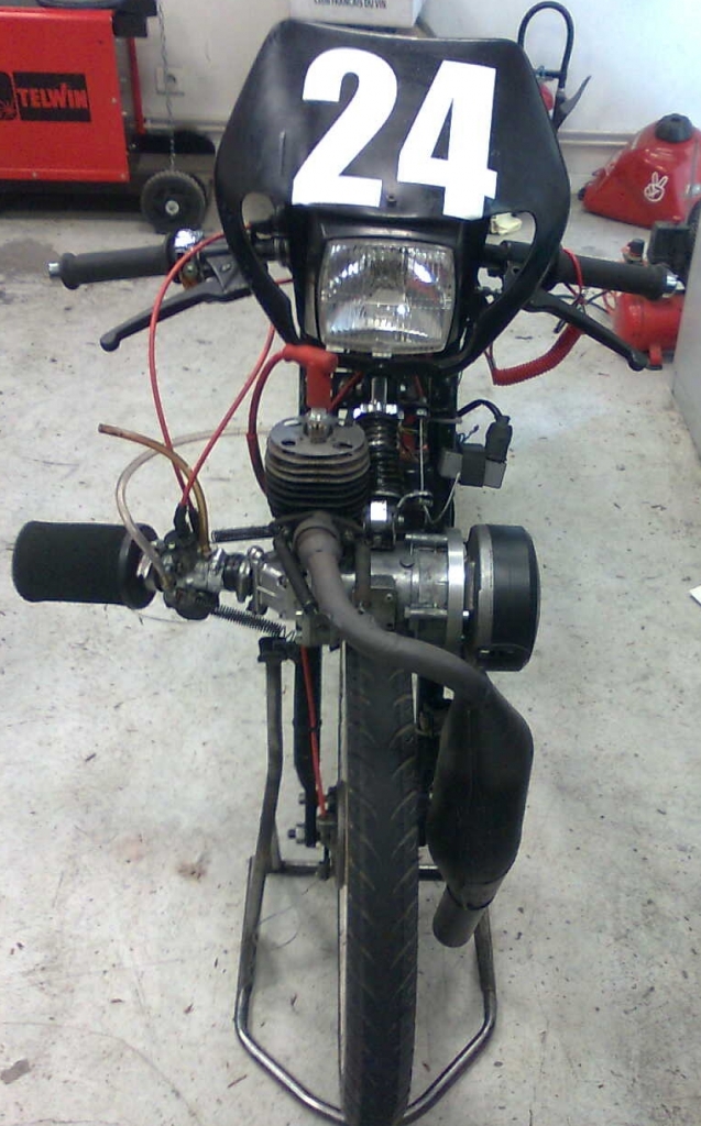 cylindre origine air 5 transferts, plan de joint de culasse raboté, cale d'embase de 3mm, allumage Peugeot 103 électronique, carburateur Del Orto 19, gicleur 108, cadre maison sur poutre 3800...