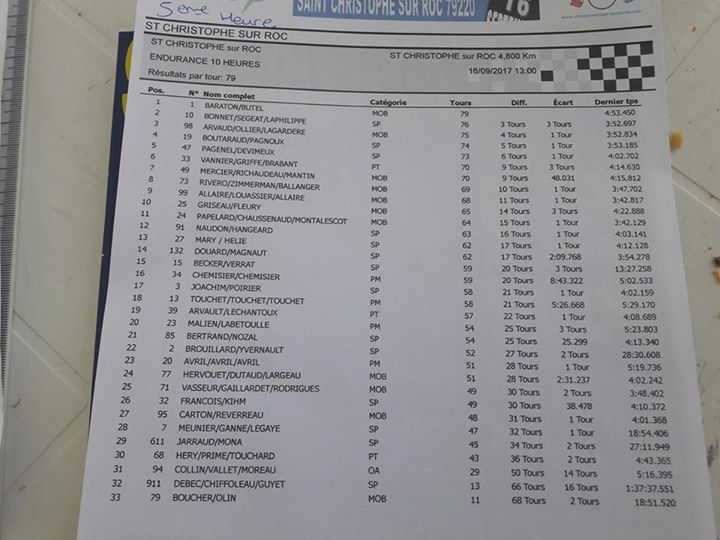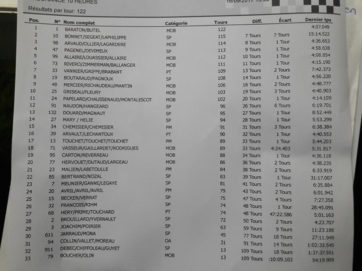Parti 23 ieme on remontera les places heure par heure, le circuit est long a enregistrer (mon cerveau se ramolli en plus avec les années), les chronos descendent de 2 secondes par tour parti a 4h25, Pierre ira nous chercher un 3h41 en baston avec Patrice sur le 47 de David Pagenel.