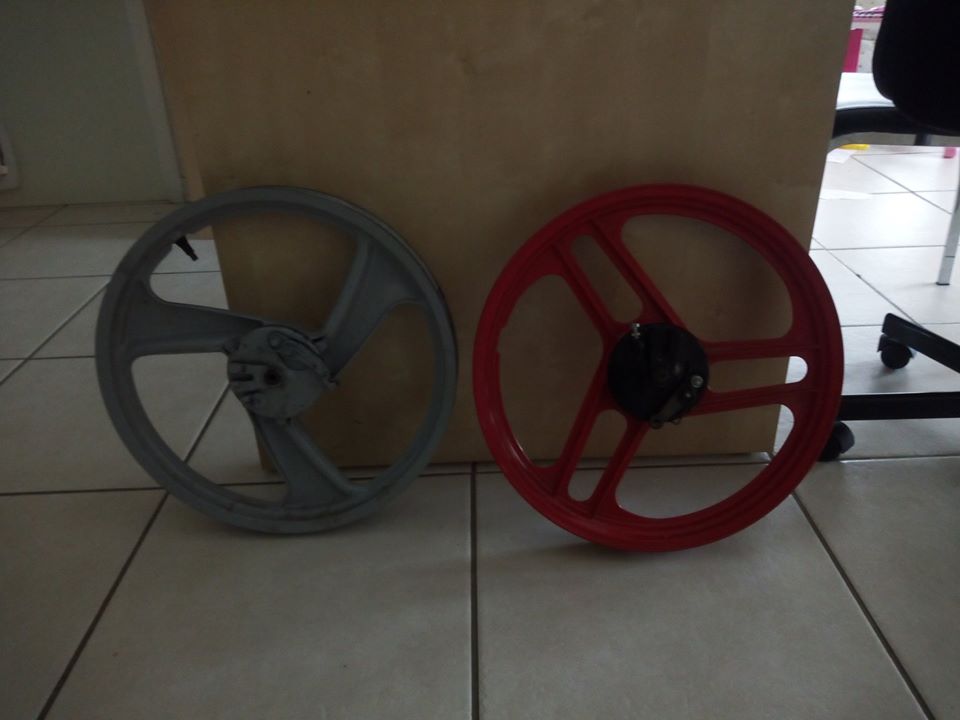 Je vends ces 2 jantes 17 pouces sans axe (débarrassées de leurs axes à billes) avec tambour, état neuf. Possibilité de monter un disque sur la grise car il y a 3 bossages susceptible d'être taraudé.