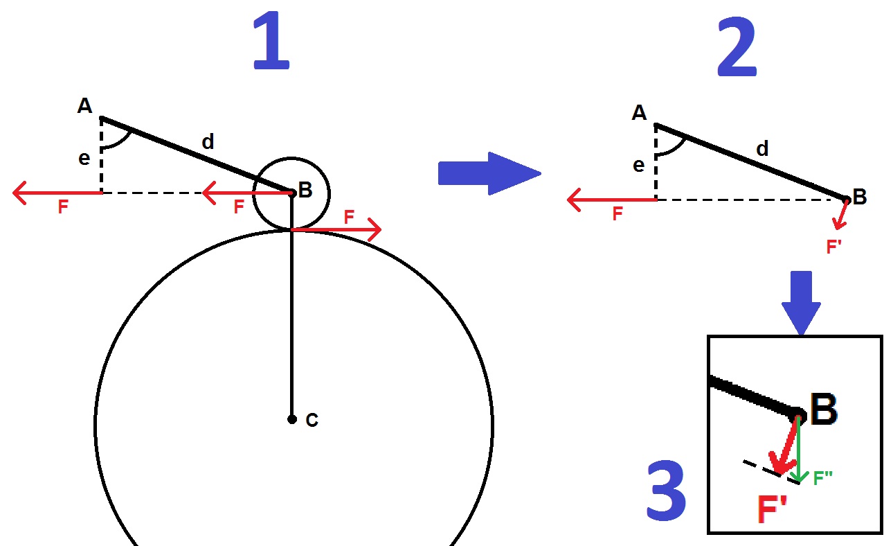 Le seul paramètre qui peut faire varier F' par rapport à F, c'est l'angle en A : il fait varier le rapport entre e et d. (Et cet angle est égal à 180°moins l'angle ABC, qu'on appelle usuellement l'angle moteur). e = d*cos(ABC)