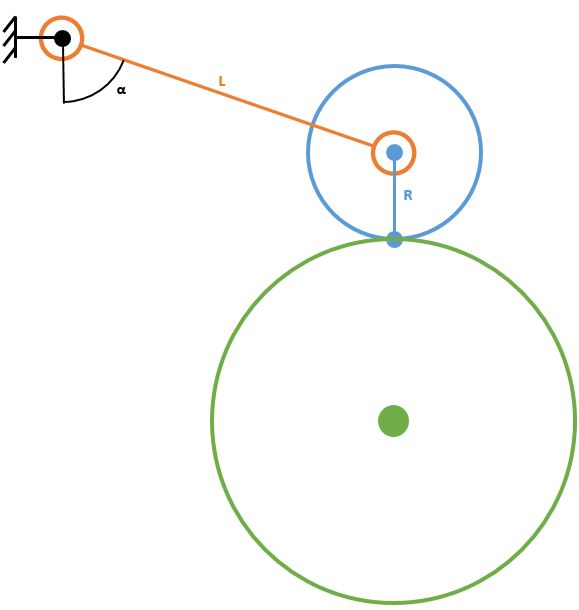 Voici le schémas en considérant le bras de de levier passe par le centre du galet, qu'il a une longueur L et formant un angle α