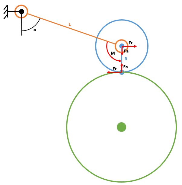 On regarde d'abord les efforts s'appliquant sur le galet, dans le cas ou il n'y a pas de glissement M est le couple moteur, Ft la force de traction et Fa la force d'appuis du galet sur le pneu que l'on cherche à déterminer: