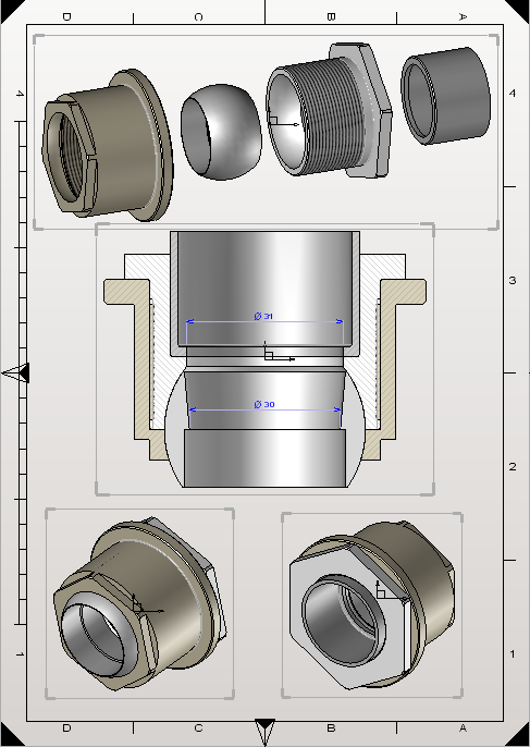 Le principe est toujours le même à savoir une rotule mâle (Øint 30), avec une rotule femelle en deux parties assemblées par vissage et une emboîture à souder sur le corps du pot pour insérer dans la rotule femelle.