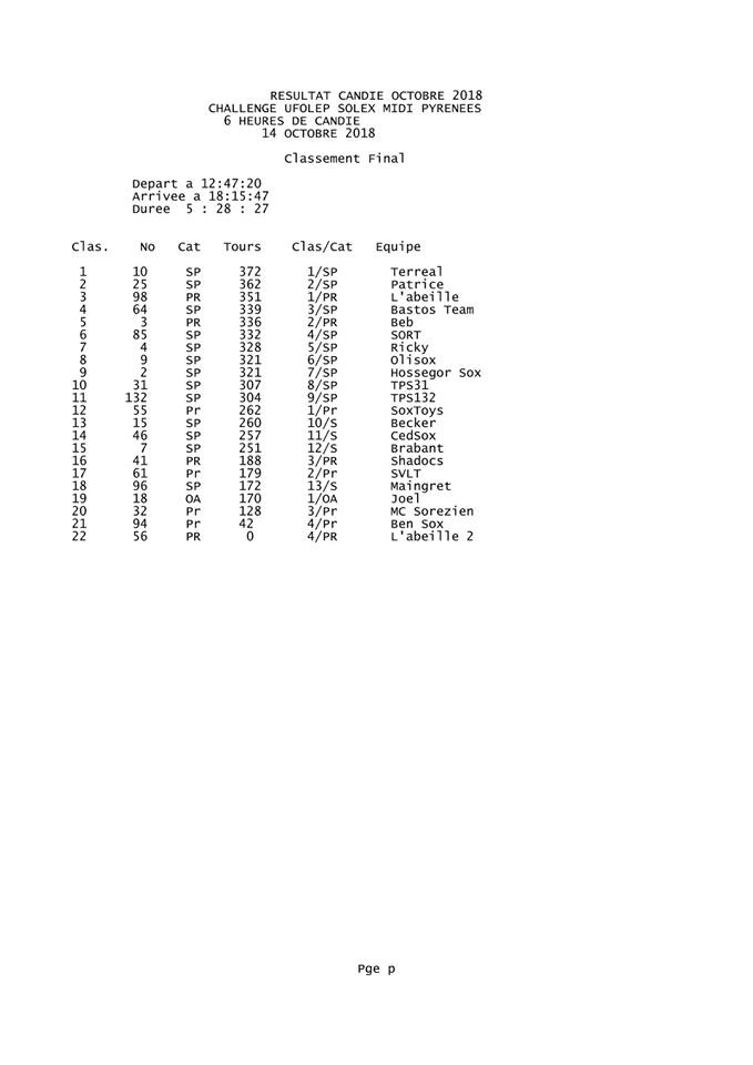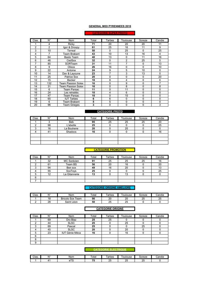 StefTeam a écrit:Résultats de Candie, un grand merci à tous ceux qui sont venus et même de très loin. Je vous réitère mes excuses pour les erreurs de pointage, c'est la dernière fois, l'année prochaine on utilisera de nouveau des transpondeurs. J'en profite pour remercier les poulettes qui m'ont aidé au pointage en début de course, MERCI BEAUCOUP Audrey Lozio, Sandy Becker et ...?, merci aux commissaires et à tous les acteurs de cette épreuve. On échappé au déluge de peu...Gros bisous à tous et à l'année prochaine....