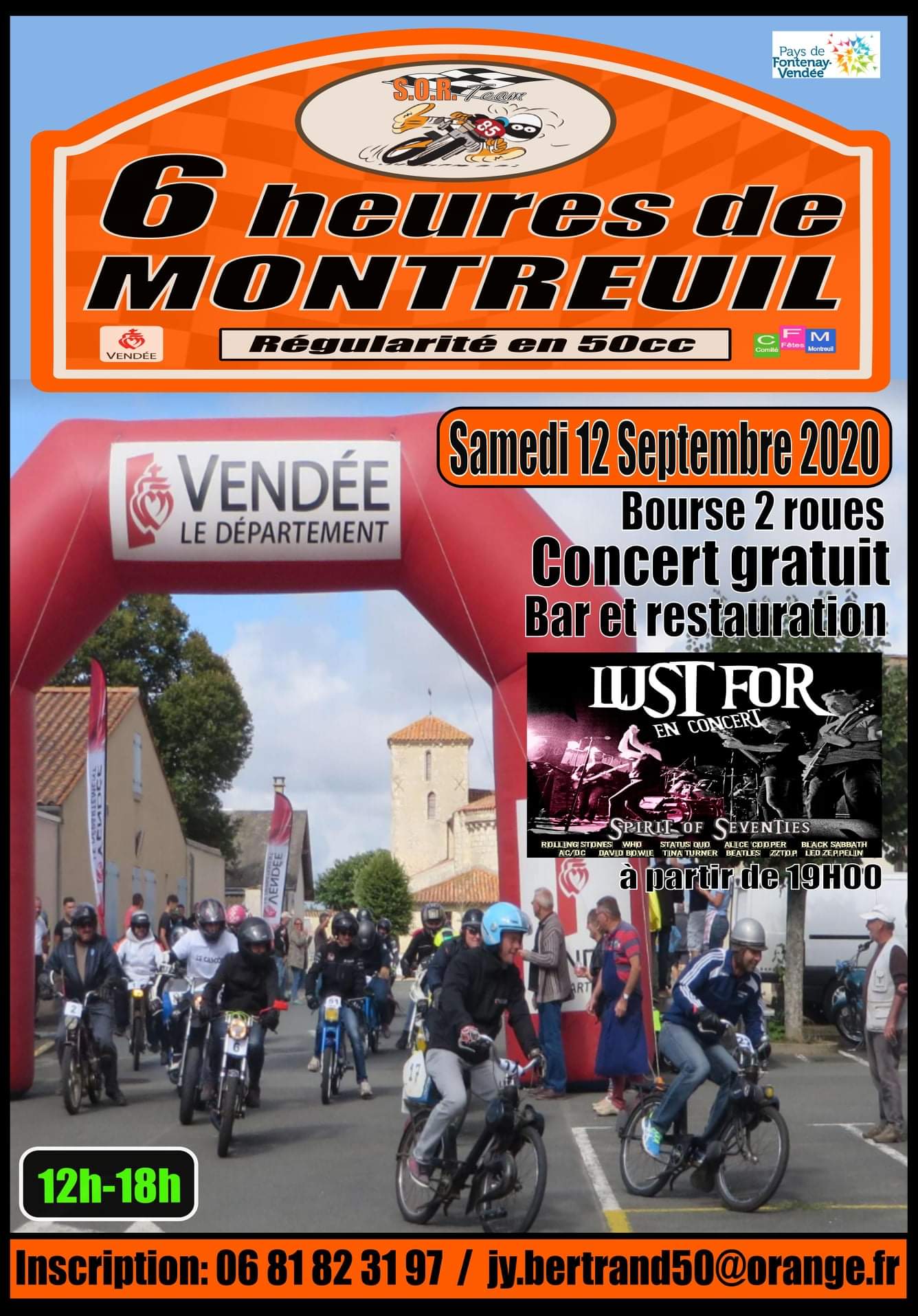Leger changement pour les 6 heures de Montreuil (85), le repas dansant est annulé et remplacé par un CONCERT GRATUIT en extérieur. Il y aura un bar et de quoi ce restaurer tout au long de la journée jusqu'a tard dans la nuit...